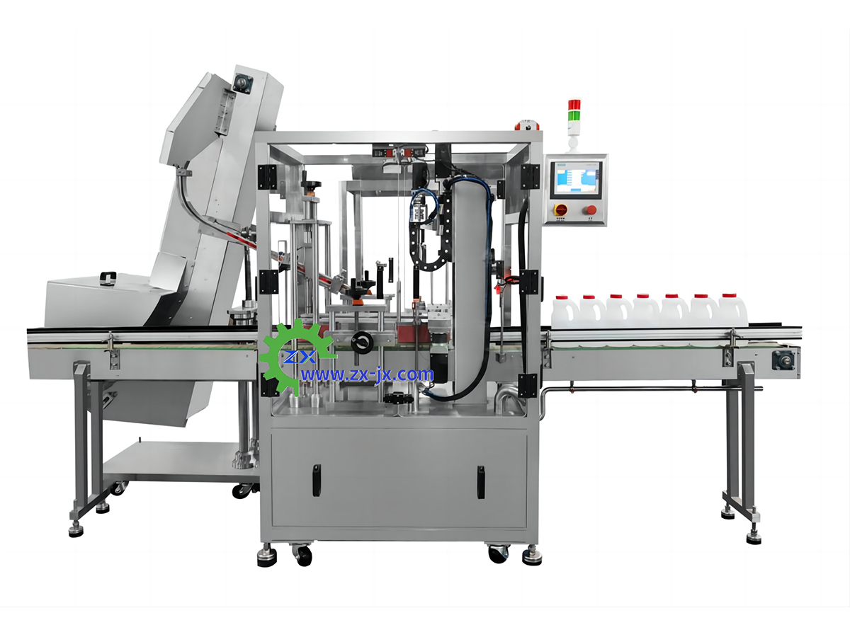 ZXCP-130自動鎖蓋機,適用于大尺寸的瓶蓋和容器,自動下蓋系統從軌道夾取蓋子,放置到瓶口,然后鎖蓋滾輪鎖蓋,自動下蓋和鎖蓋系統由伺服馬達控制,確保鎖蓋精準率。